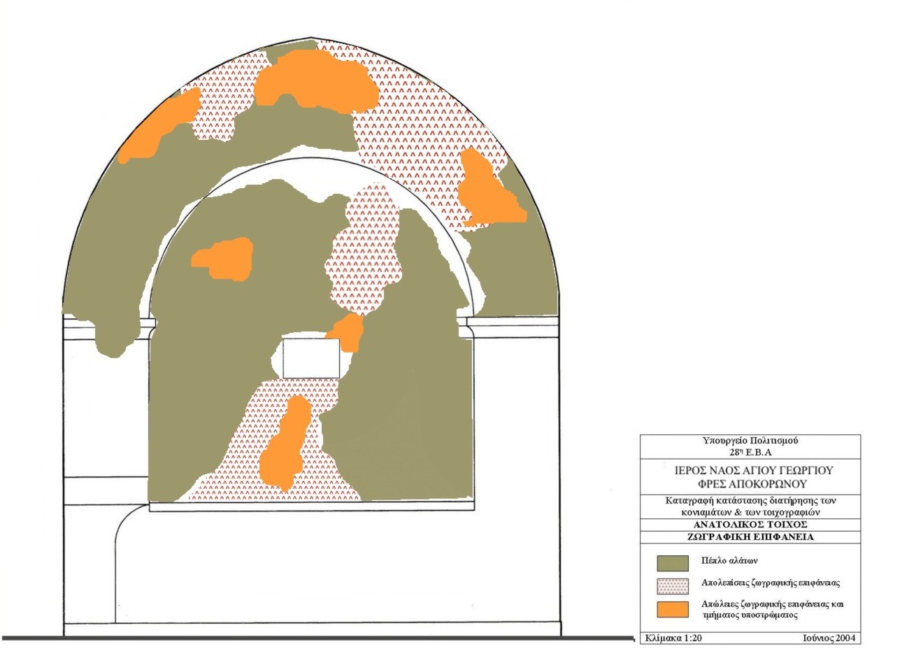 Περιλαμβάνει: 1) Πέπλο αλάτων, 2) Απολεπίσεις ζωγραφικής επιφάνειας, 3) Απώλειες ζωγραφικής επιφάνειας και τμήματος υποστρώματος.
